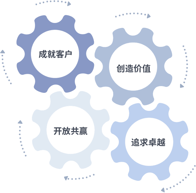 成就客户是一切决策的出发点,,,,创造价值是衡量所有工作的标准,,追求卓越是我们做事做人的态度,,,,开放共赢是我们的格局也是最终的结果。。。。价值观的齿轮环环相扣,,,推动着组织里的每个人不断向前。。。
